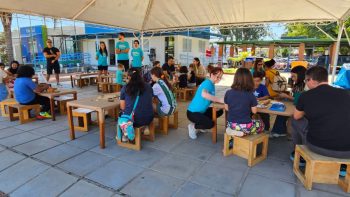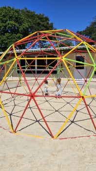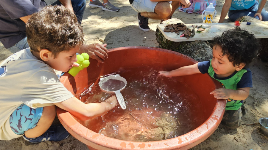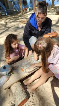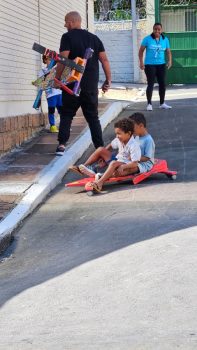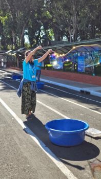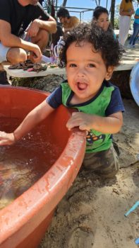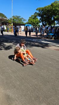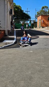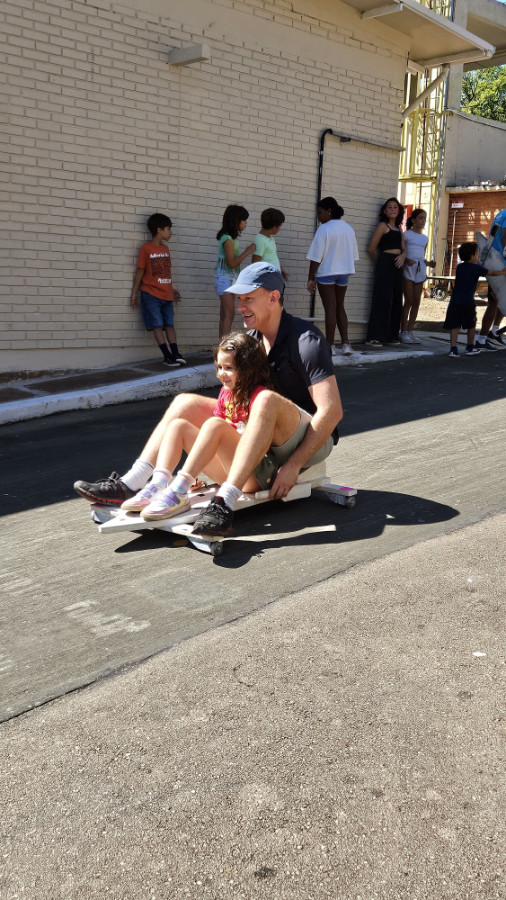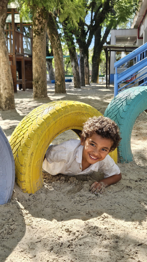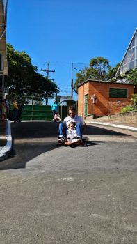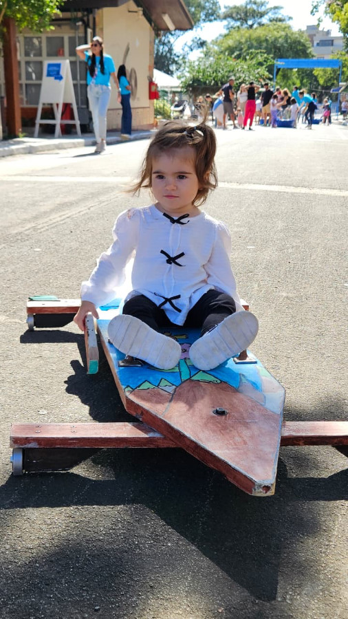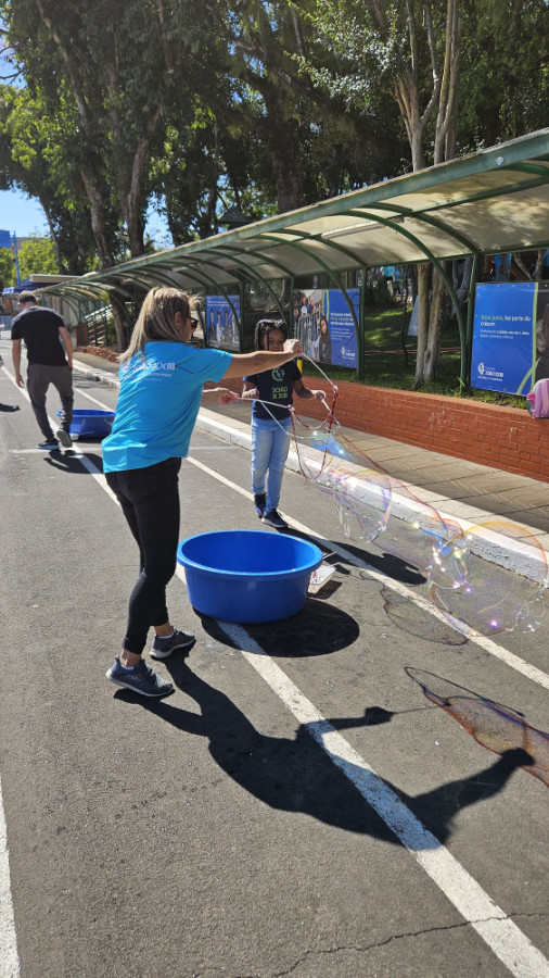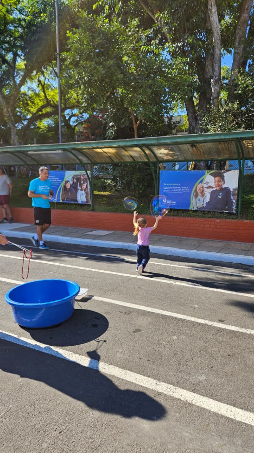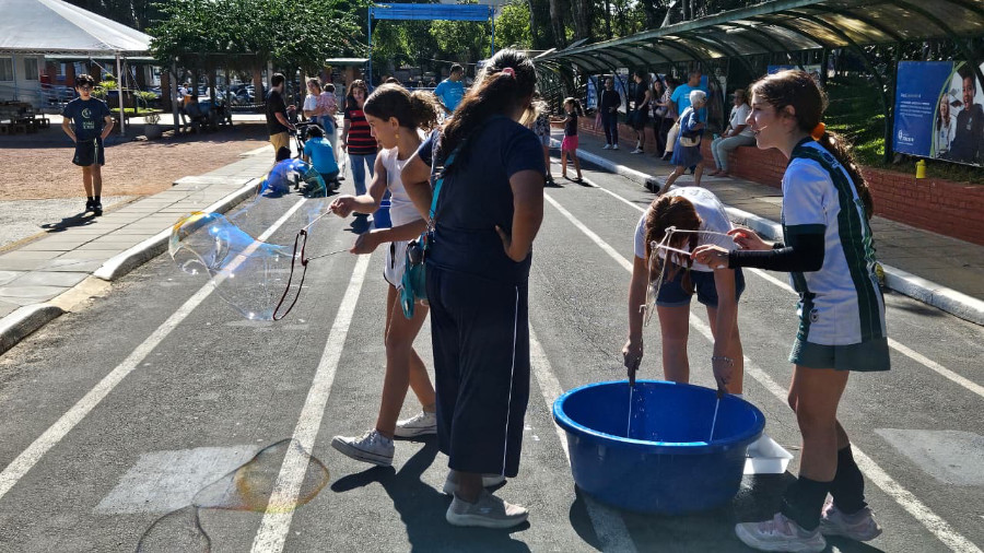 Dando sequência à programação, as famílias e crianças do Núcleo da Infância participaram de vivências brincantes no pátio da Educação Infantil, no Gazebo Bouganville, na rua de entrada do Colégio com bolhas gigantes de sabão, na Rampa lateral da cantina com os carrinhos de rolimã, na Alameda das Árvores, no Campão, no pátio de areia, na Minifloresta e no Anfiteatro.