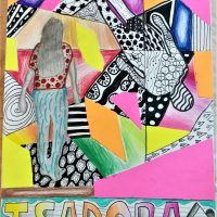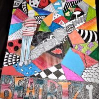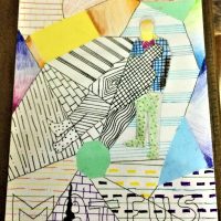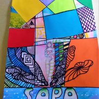 A proposta de trabalho era “além do fundo abstrato, lembrar que o nome fará parte do trabalho através do desenho das letras, o qual deve interagir com o restante da composição. A técnica da atividade deve ser mista, aliando o desenho com a colagem”, finaliza a professora.