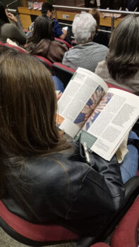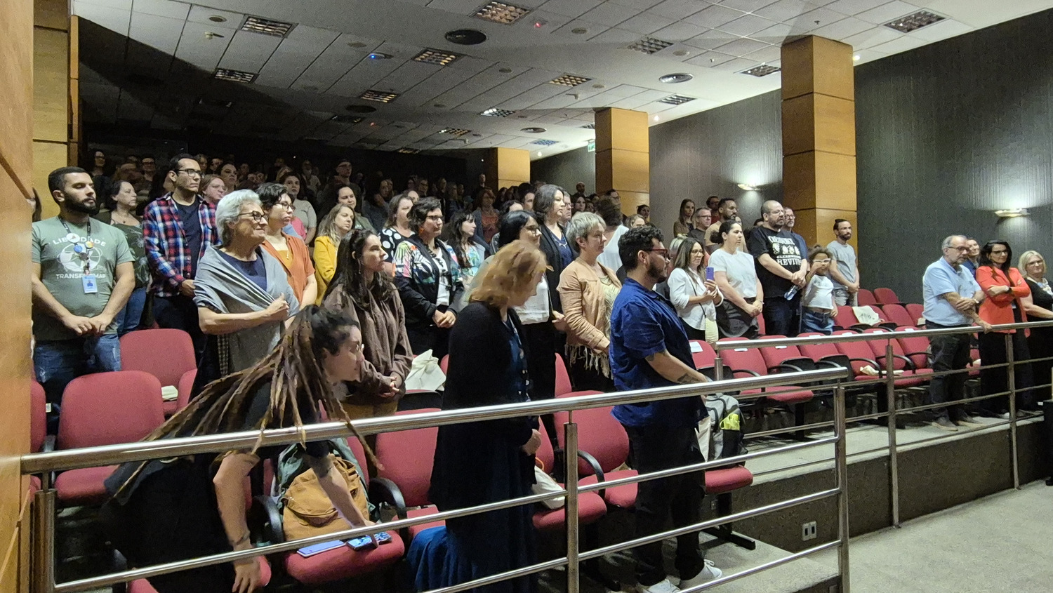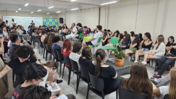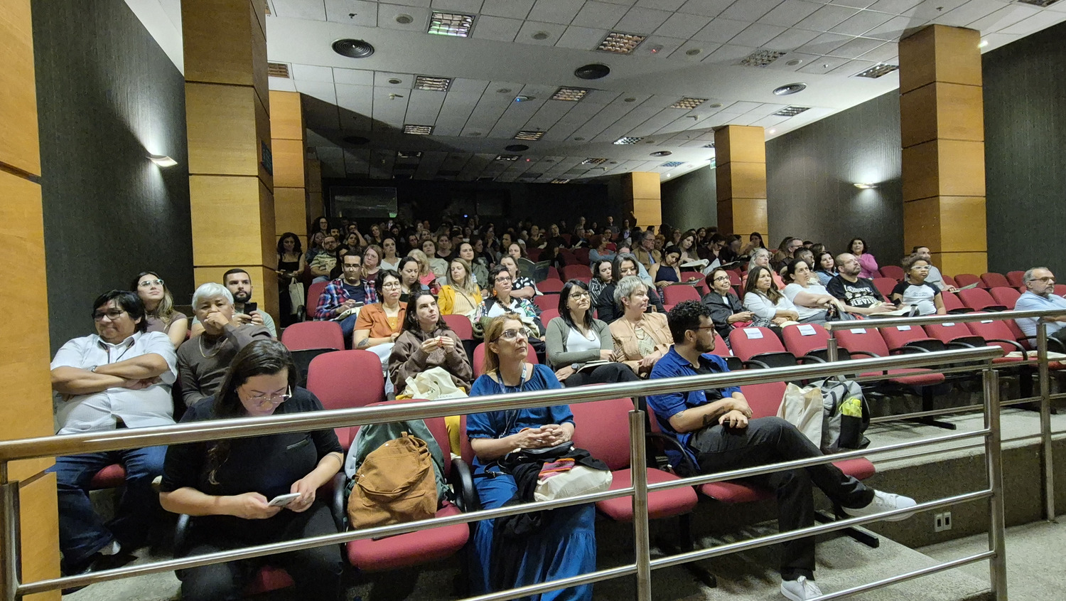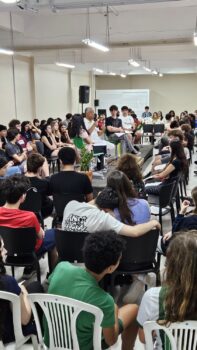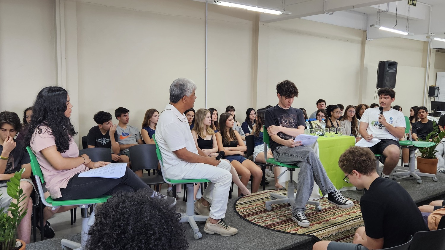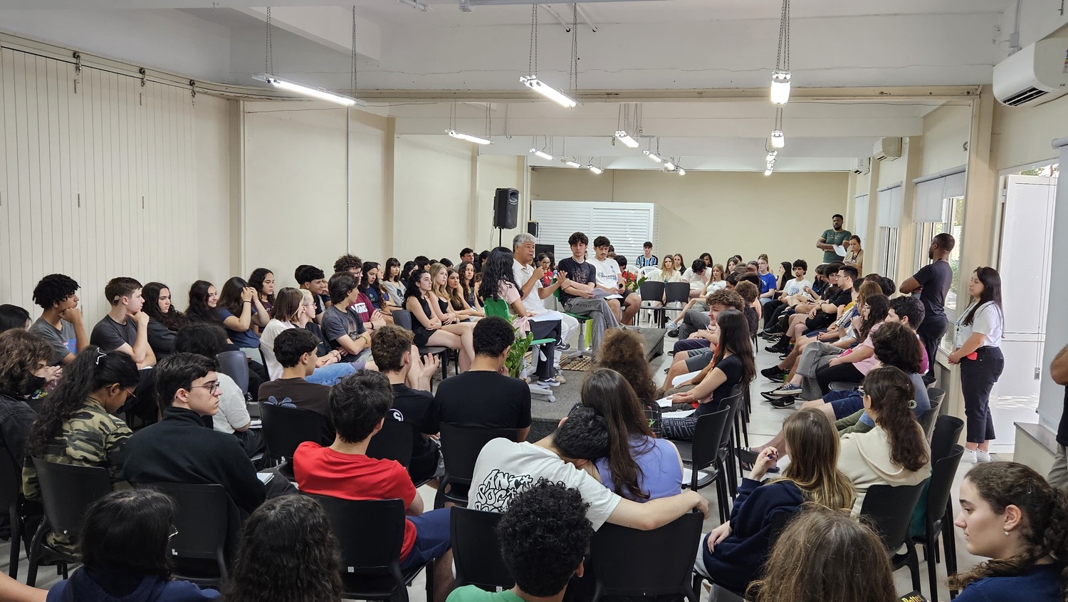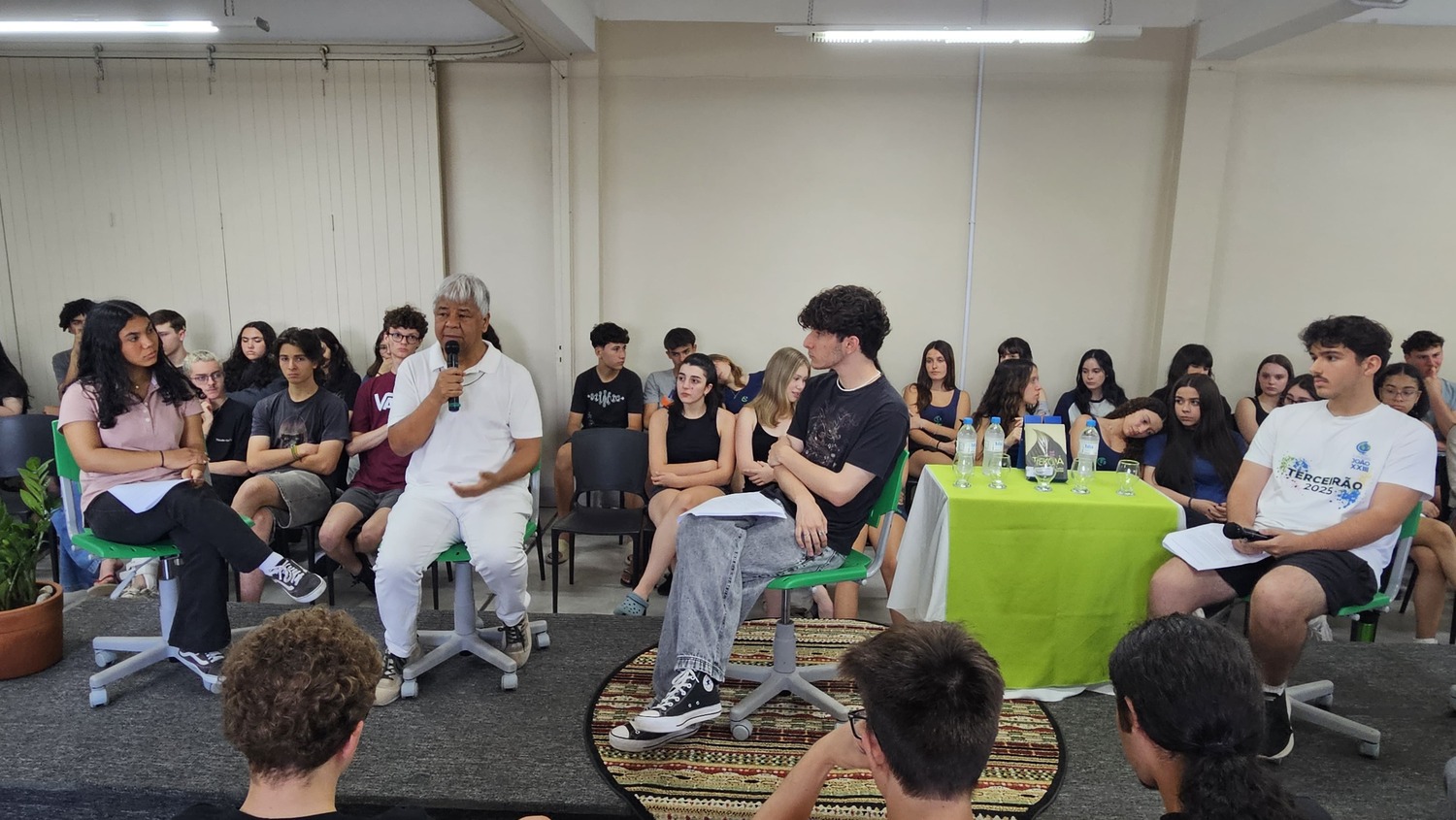 Dando continuidade à formação, no dia 14 de novembro foi a vez dos estudantes do Ensino Médio (EM) participarem de uma conversa reflexiva com o escritor indígena, no auditório do Colégio. A conversa foi mediada pelos estudantes da 3ª série, que fizeram perguntas elaboradas pelas turmas do EM.