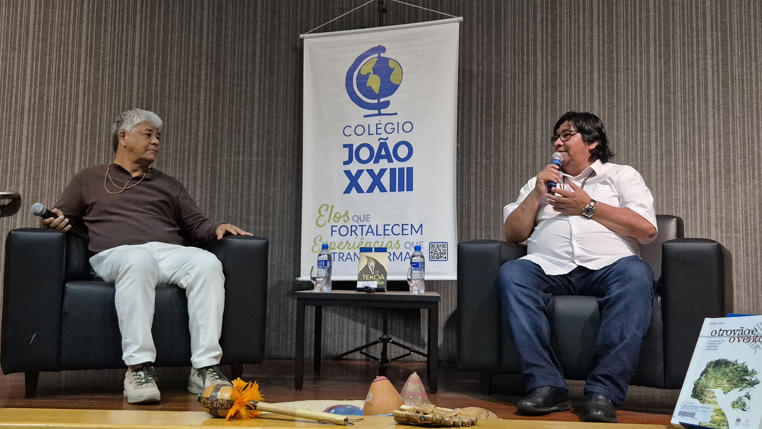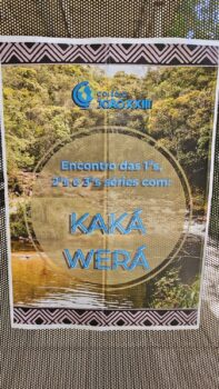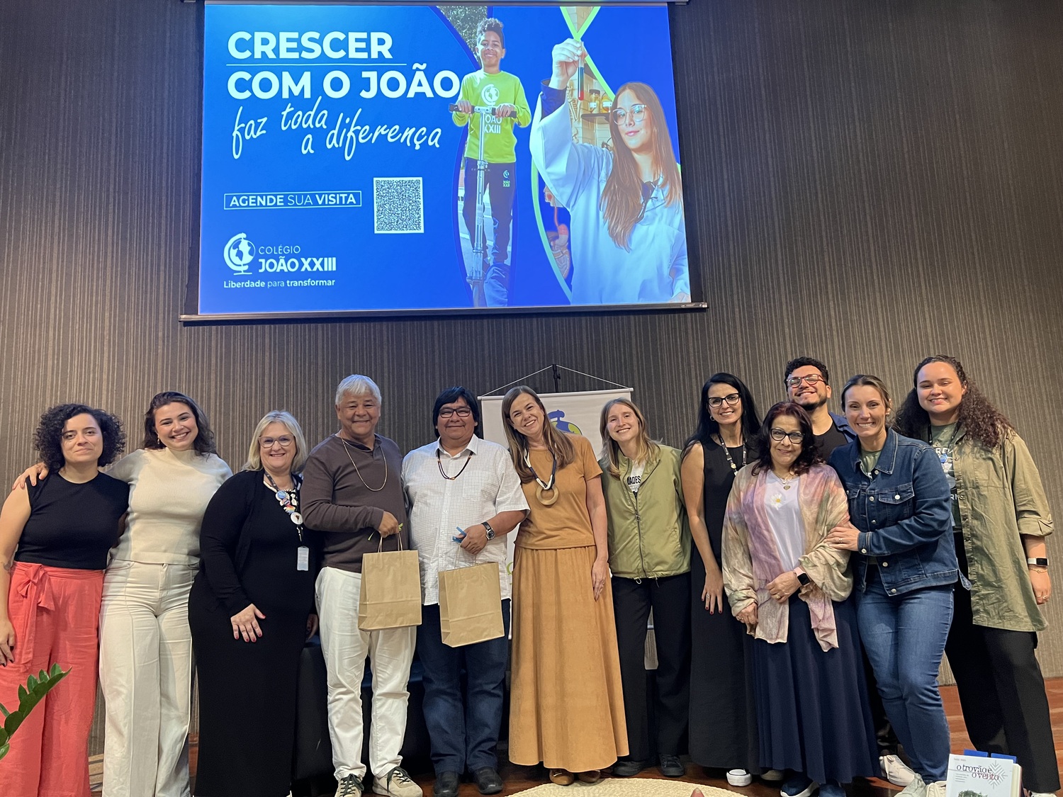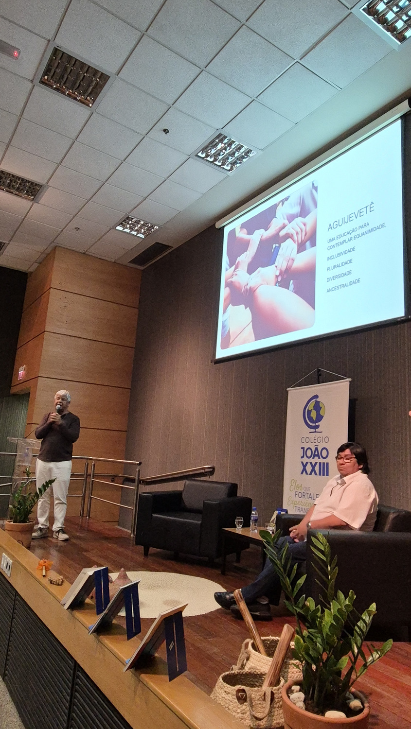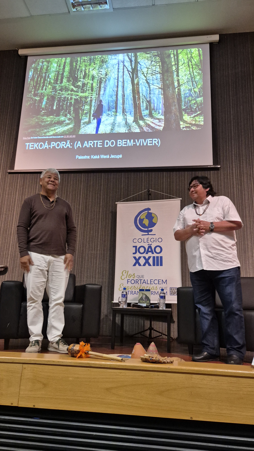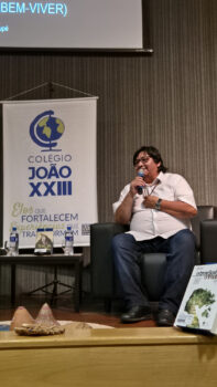 No dia 13 de novembro, no Auditório do prédio 50 da PUCRS, nossa Escola acolheu o escritor indígena Kaká Werá Jecupé. O momento foi oportunizado pelo Colégio João XXIII através do Núcleo de Formação para a comunidade escolar (estudantes, famílias e profissionais), parceiros, entidades, universidades e profissionais de educação. O Seminário Educação para a arte do bem-viver foi o momento de propor uma reflexão sobre ancestralidade, natureza, cuidado e comunidade e contou com a venda dos livros do escritor e com duas sessões de autógrafos.
