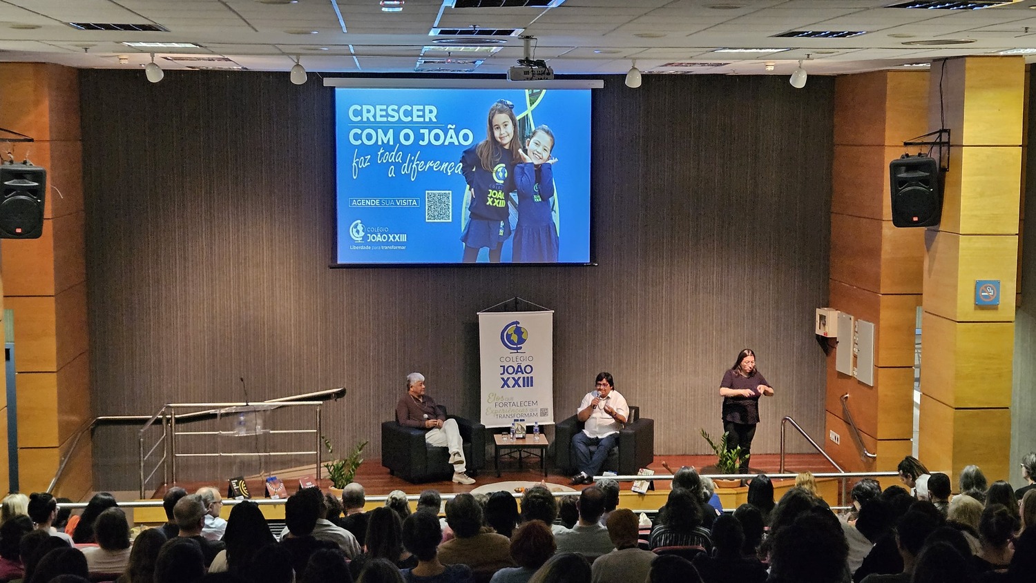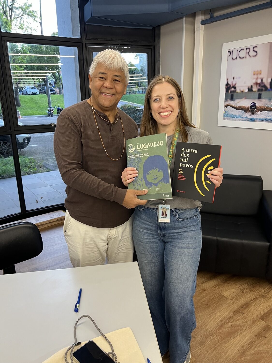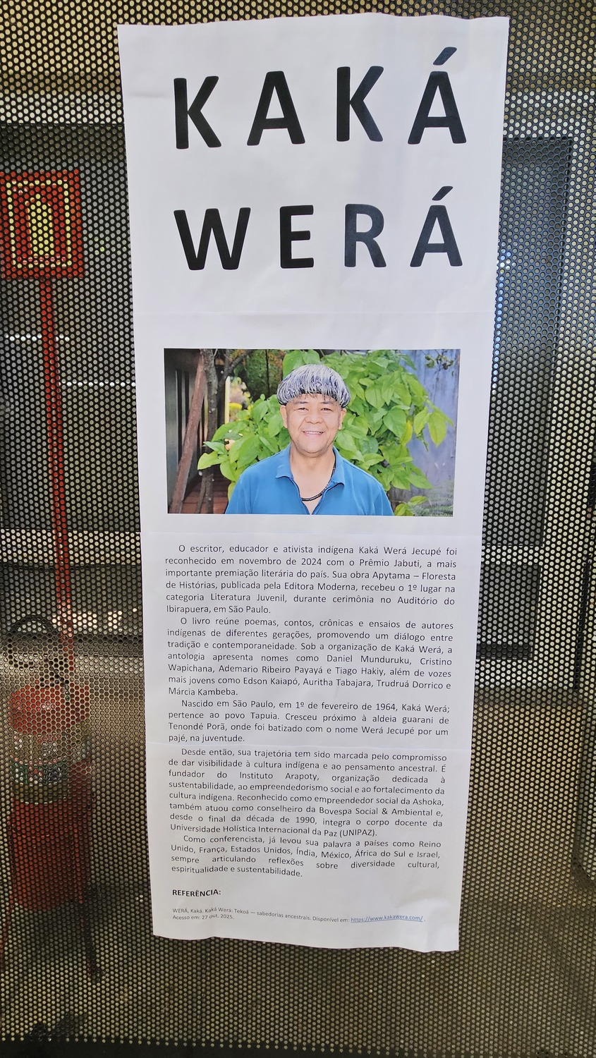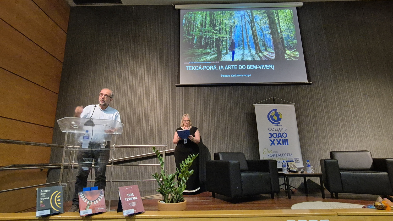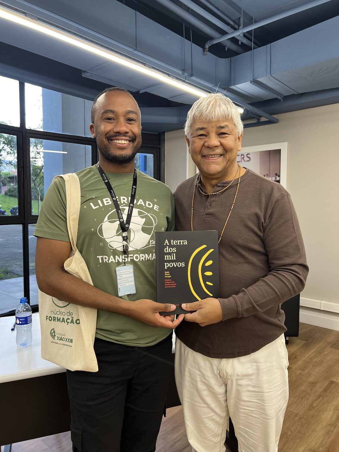 No dia 13 de novembro, no Auditório do prédio 50 da PUCRS, nossa Escola acolheu o escritor indígena Kaká Werá Jecupé. O momento foi oportunizado pelo Colégio João XXIII através do Núcleo de Formação para a comunidade escolar (estudantes, famílias e profissionais), parceiros, entidades, universidades e profissionais de educação. O Seminário Educação para a arte do bem-viver foi o momento de propor uma reflexão sobre ancestralidade, natureza, cuidado e comunidade e contou com a venda dos livros do escritor e com duas sessões de autógrafos.