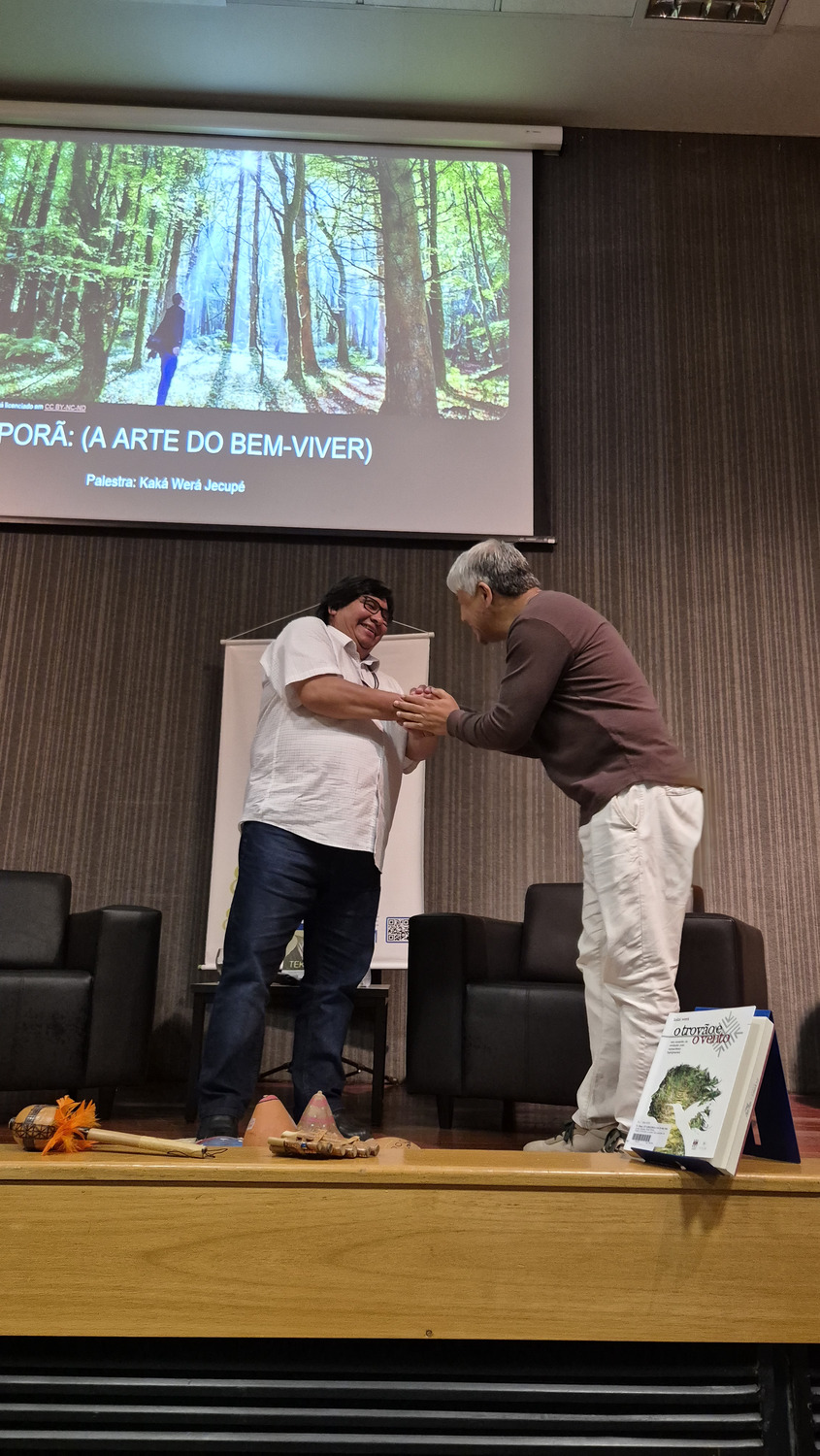 Durante o Seminário o escritor falou sobre a história dos povos indígenas, trouxe marcas que os constituíram e problematizou os vieses pelos quais conhecemos suas histórias, abordou conceitos dos seus livros em um convite para a compreensão de diferentes camadas diante de um mesmo tema, como por exemplo a arte do bem-viver, nos convidando a todo momento a uma nova forma de ver e sentir a Mãe Terra e pensar a relação entre o ser humano e a natureza. No final da formação Kaká e Bruno responderam algumas perguntas da plateia que problematizou conceitos sobre amor e questionou sobre as trajetórias de luta dos povos indígenas e propôs uma reflexão em relação às escolas indígenas. Ao compartilhar sua sabedoria ancestral, ele convidou a plateia a repensar a educação como um ato de conexão e de pertencimento com o outro, a comunidade e a própria Terra.