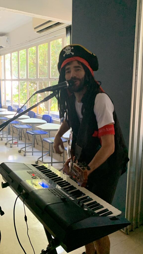 A aventura foi percorrer diferentes espaços da escola desvendando as informações que levavam à surpresa. O final da charada levou-as até uma sala de aula, e lá estava ele: o pirata Cara de Mau, que na verdade, é “mau” só no nome. O professor Bob, fantasiado de pirata, alegrou as turmas com muita música.
