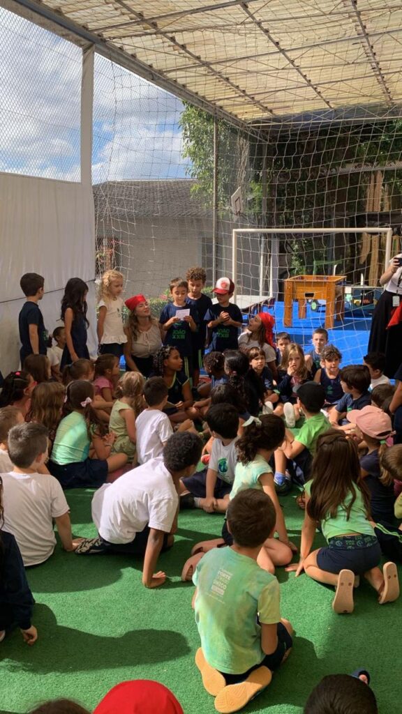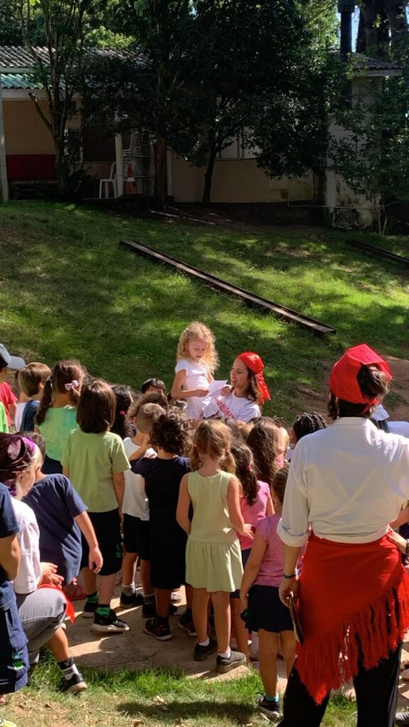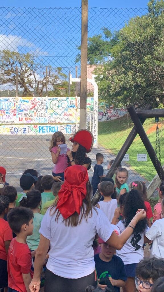 A preparação para o momento foi vivida ao longo de uma semana. As professoras de todas as turmas foram apresentando bilhetes que aguçavam a curiosidade das crianças. Uma das pistas chegou em formato de pergaminho, avisando que todos deveriam comparecer no dia seguinte. “Bem que eu senti um cheiro de quem não toma banho há 15 dias”, foi o comentário da Ana Clara, da turma 1F, ao saber que o mistério envolvia um pirata.