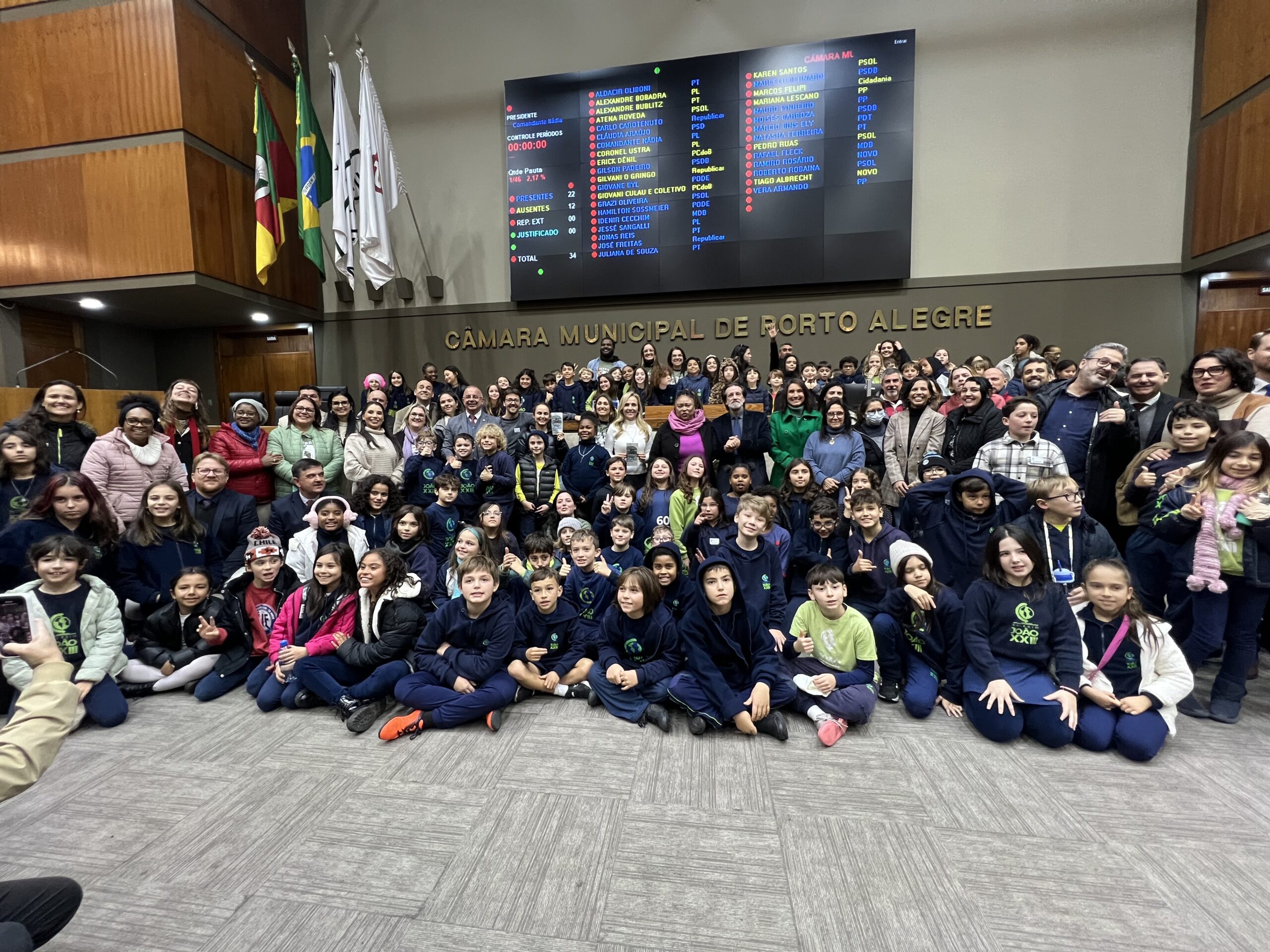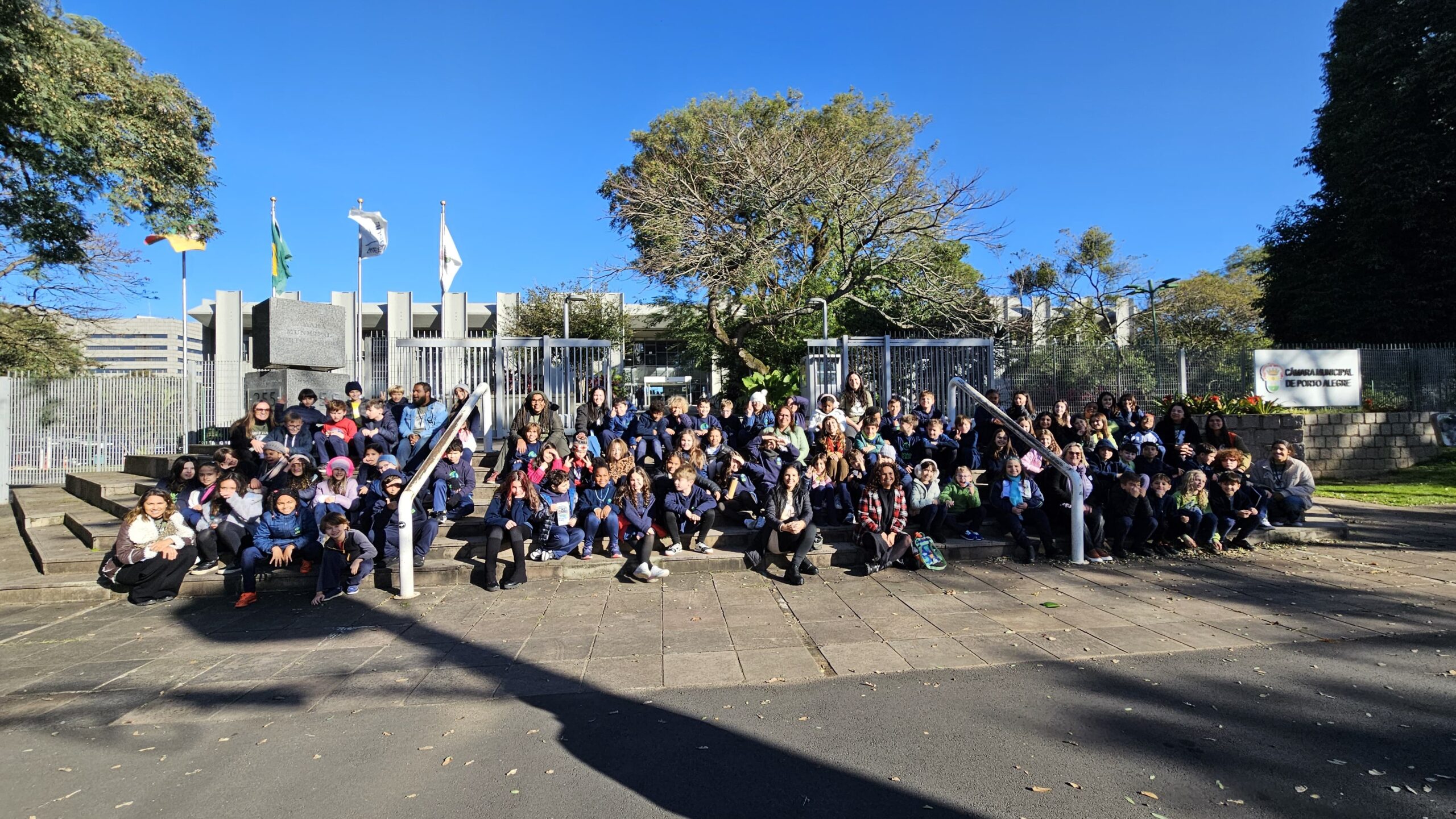 No dia 23 de junho, a equipe pedagógica do Colégio João XXIII esteve com os estudantes do 3º e 4º ano do Ensino Fundamental (EF) de 2024 e com seus familiares, na Câmara Municipal de Porto Alegre para uma homenagem e exibição dos trabalhos realizados para o Congresso “João chama para a cura do mundo”. Esse momento especial é uma das ações propostas pela vereadora Grazi Oliveira, relacionado ao desdobramento da parceria entre o Colégio e a Câmara.