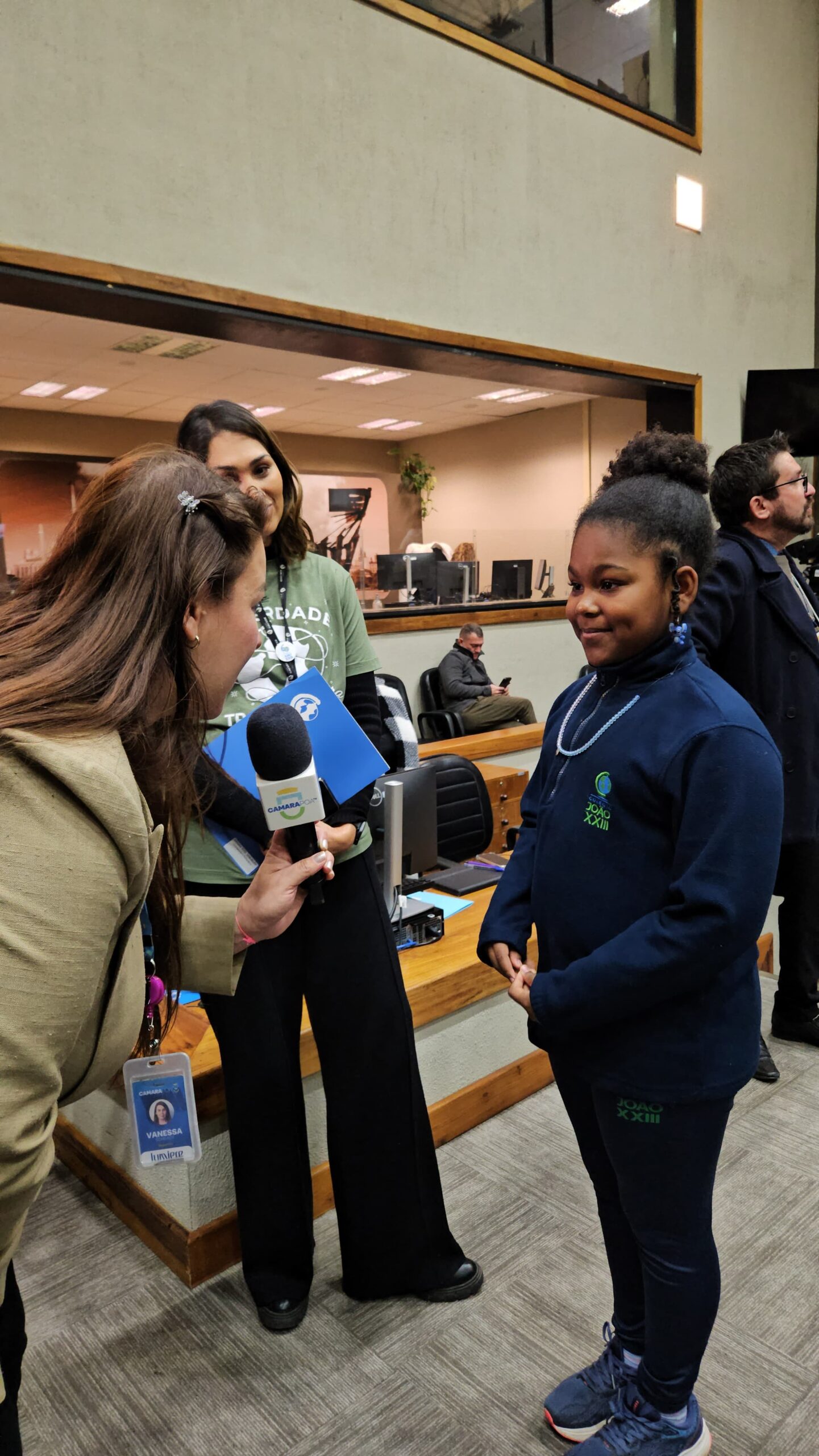 Ao final da homenagem, a estudante Annalú Guterres e a coordenadora pedagógica deram entrevista para a TV Câmara. Estiveram presentes na homenagem a diretora Paula Poli, a vice-diretora Fernanda Radajeski, a coordenadora pedagógica do 5º ao 8º ano do EF, Ianne Ely Godoi Vieira, o presidente da Fundação Educacional João XXIII, José Carlos Monteiro da Conceição, a laboratorista Bibiana Ramos, as professoras das turmas de 3º e 4º do EF de 2024, estagiários(as) e monitores(as).