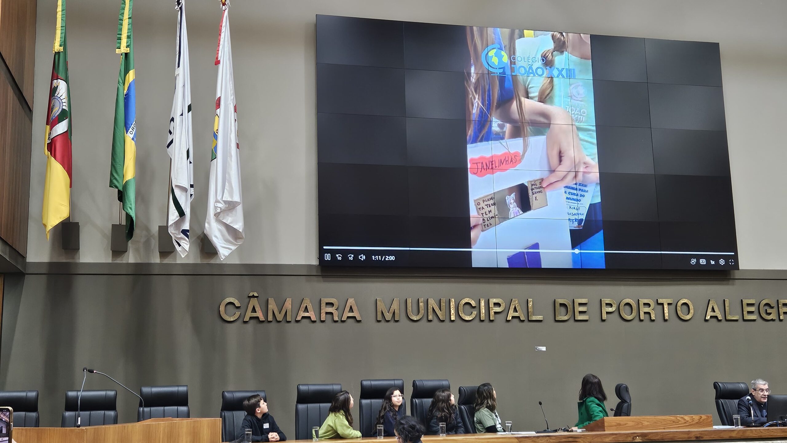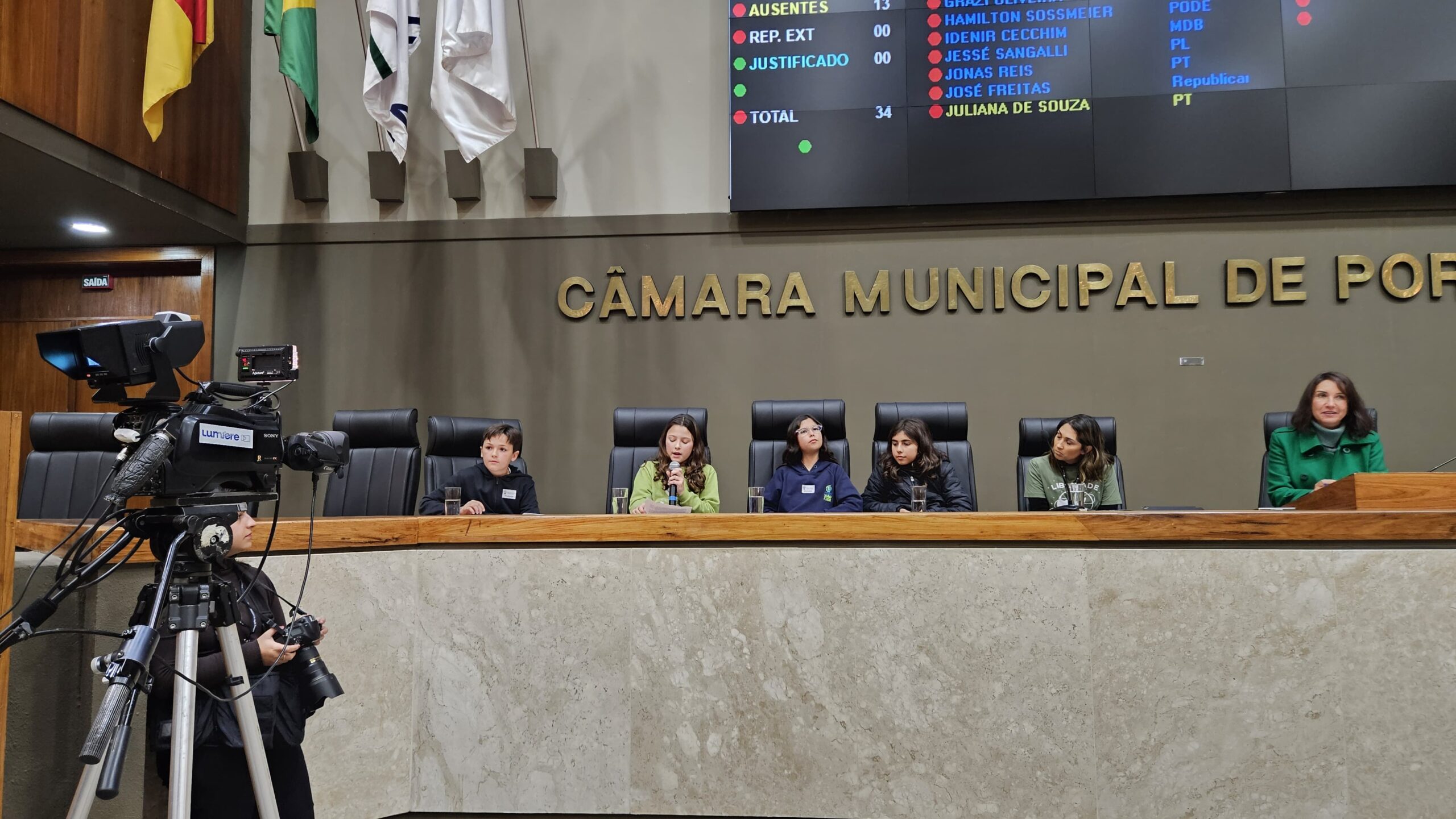 Antes da abertura do plenário, a vereadora Grazi Oliveira foi entrevistada pela TV Câmara para falar sobre a homenagem e o “Guia de ideias que vão mudar o mundo”. Ela destacou a importância do tratamento do lixo e uso da água e tratamento pelo DMAE. A educadora Eduarda Morales e o estudante do 5º ano do EF, Joaquim Brusque, também foram entrevistados e falaram sobre a importância da discussão sobre temas ambientais, principalmente a crise climática que resultou na maior enchente que o RS já teve.