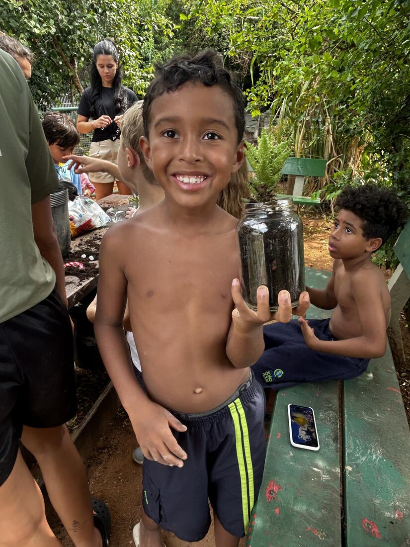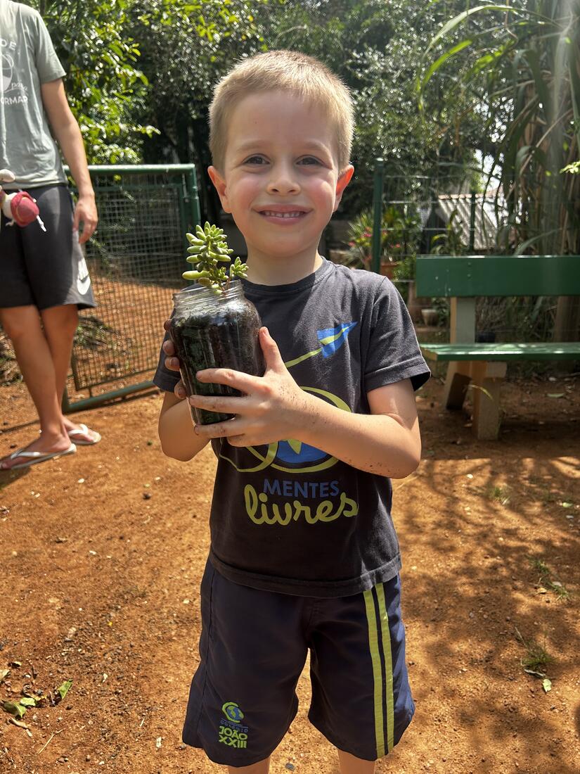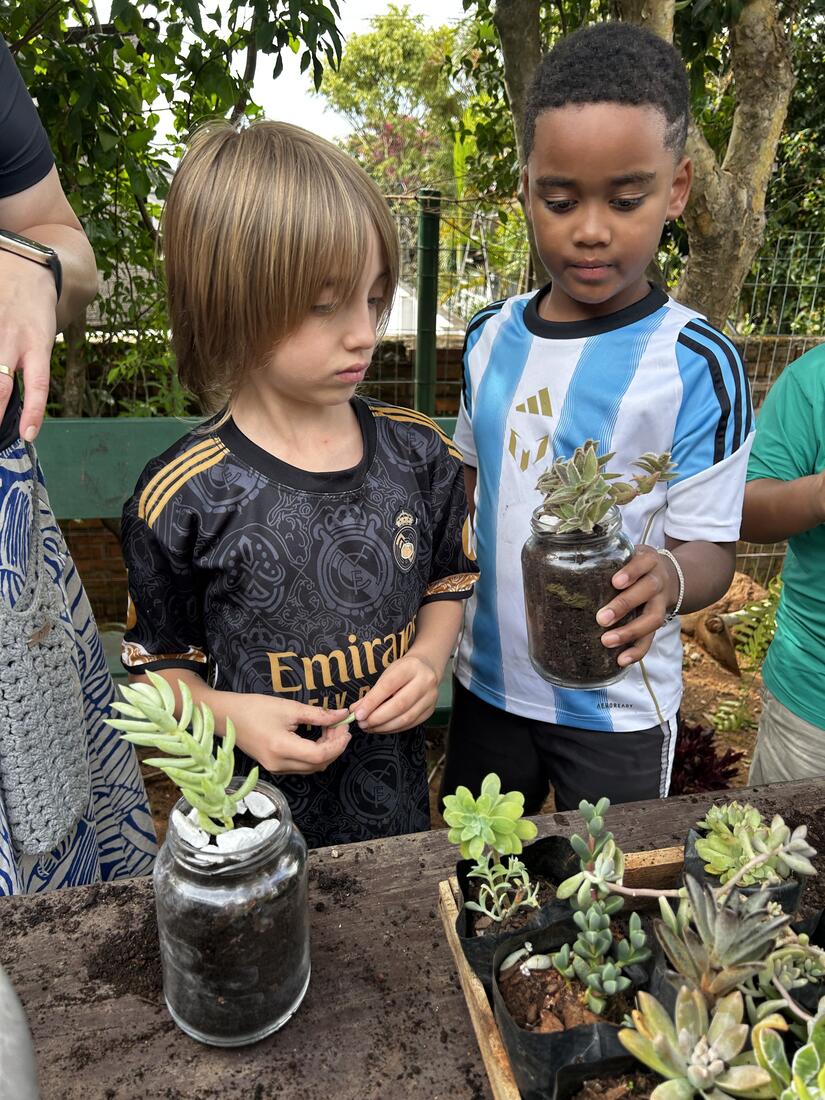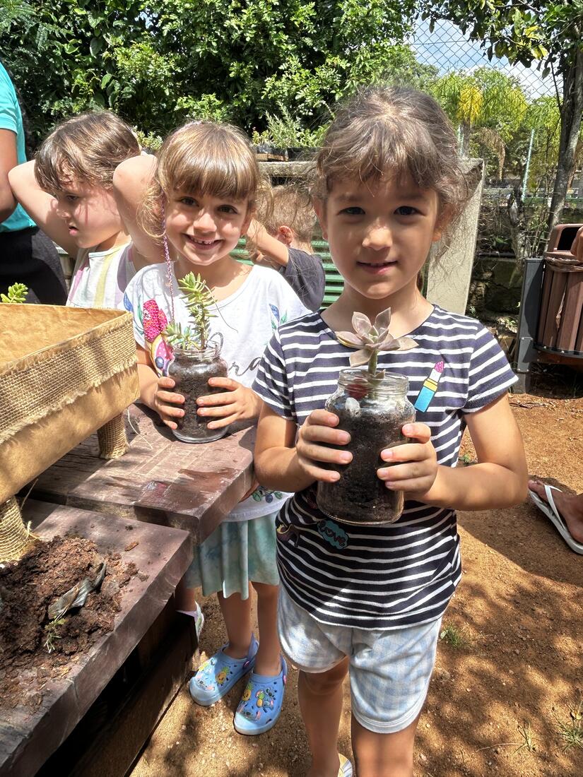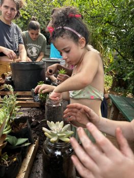 Para fechar esses 10 dias intensos, as crianças foram à horta para fazer seu Pote Mágico, que consistia em plantar mudas de suculentas em potes de vidro, decorados por elas. Após o plantio, elas levaram suas produções para casa, para que junto à família sigam cuidando e acompanhando o crescimento das plantinhas.