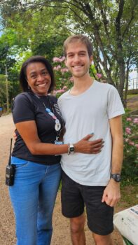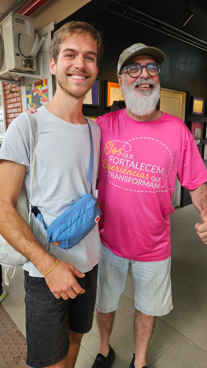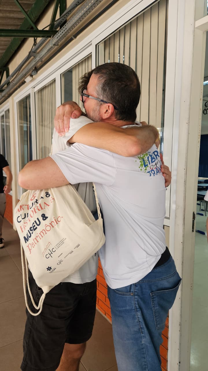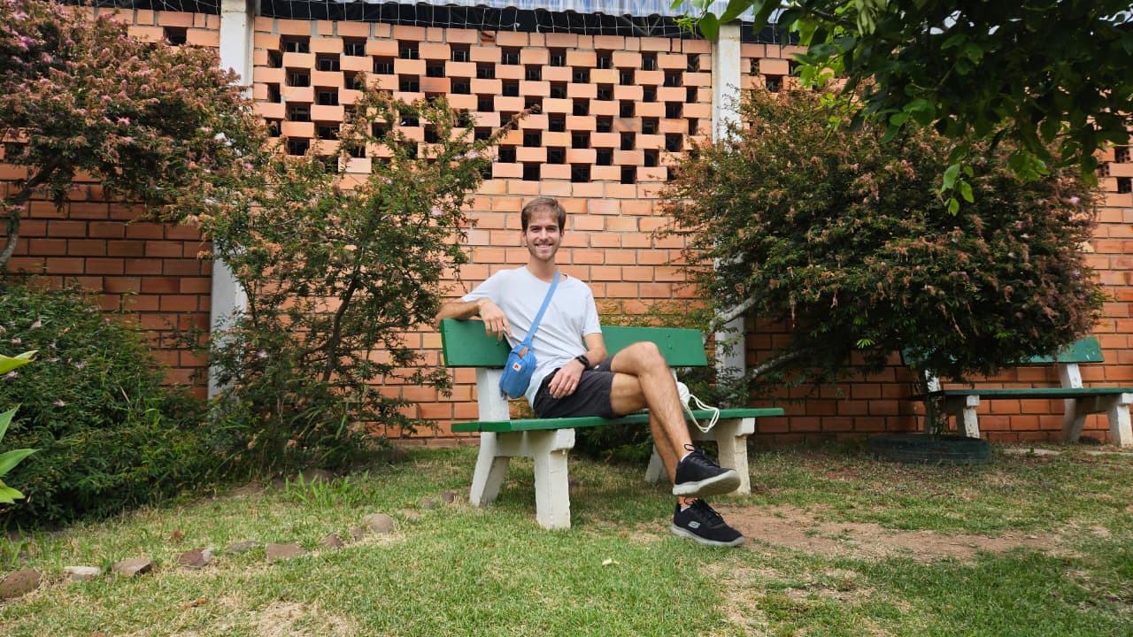 “Quando entrei percebi que tinham coisas diferente e ao mesmo tempo tão iguais de quando estudei aqui. Fiquei muito feliz em ver os alunos estudando fora da sala de aula, ao ar livre. Eu fui olhando para tudo ao meu redor e as memórias foram vindo como gavetinhas que se abriam conforme eu ia sentindo. Quando vi a quadra verde, lembrei de quando a gente jogava bola ali, daquele prédio na entrada que era menor e com uma lojinha pequena. Lembro da Tina e o seu famoso chá que curava tudo. A Lu que é muito querida. Da árvore de ameixa que tinha ali perto da quadra de piche. Eu e meu amigo subíamos nela todos os dias no recreio e pegava as ameixas. Era nosso QG. A gente se sentia meio dono do colégio.”